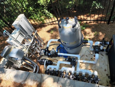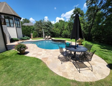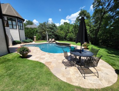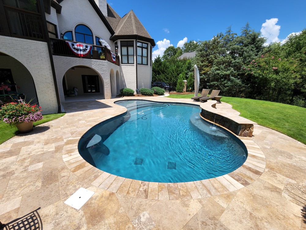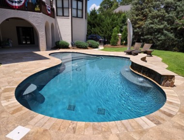 18x36 freeform gunite, depth 8ft - 3ft, french gray plaster, tanning ledge, coping travertine noche, sheer decent waterfall - natural stone. The deck is travertine noche color french pattern. This pool also has led lights, a heat pump, Jandy pool pump with variable speed.